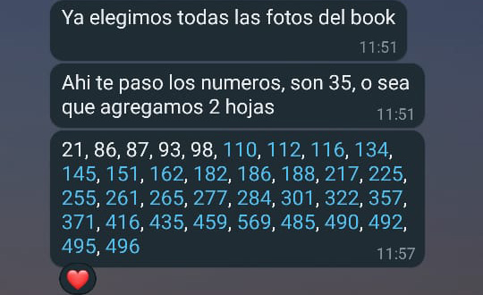 3 – La única forma de pasarnos esa selección de fotos, es por whatsapp y con los códigos de las fotos. Todas las fotos tienen un código entre parentesis. Les dejamos un ejemplo: